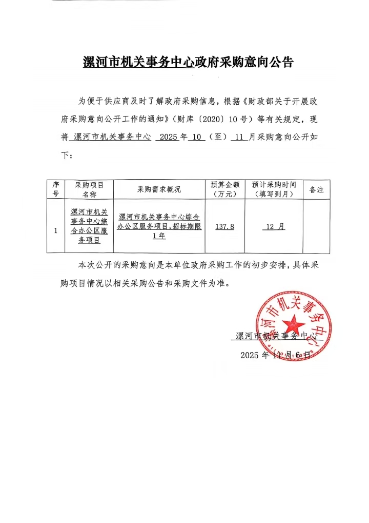 为便于供应商及时了解政府采购信息,根据《河南******事务中心 2025年11(至)12月采购意向公开如下: